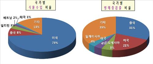 농식물 수입 건수는 미국이 45만5천41건으로 가장 많았고 병해충 검출 건수는 중국산 수입식물에서 가장 많은 2천270건(31%)이 검출됐다.