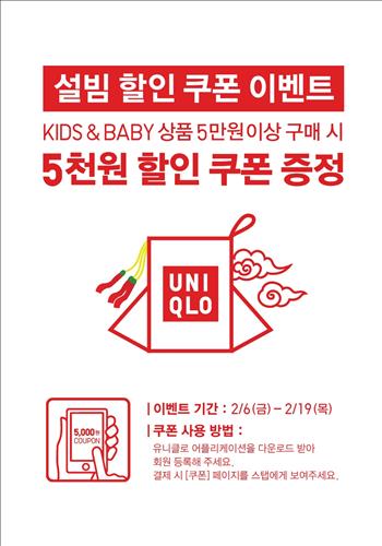 (서울=연합뉴스) 고유선 기자 = SPA(제조·유통 일괄형) 브랜드 유니클로는 설을 맞아 유아동 제품 구매고객을 대상으로 19일까지 '설빔 할인쿠폰 이벤트'를 진행한다고 9일 밝혔다. 유아동 제품을 5만원 이상 구매하는 소비자는 유니클로 모바일 애플리케이션의 쿠폰 페이지를 매장 직원에게 보여주면 5천원 할인 혜택을 받을 수 있다.