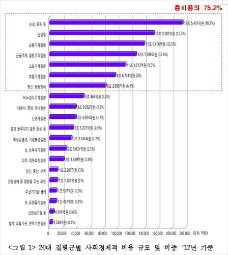 보고서에 따르면 2012년을 기준으로 전체 질병으로 인한 사회적 손실은 120조 6천532억원으로 집계됐다. 이는 국내총생산(GDP)의 8.8%에 해당하는 것으로, 2008년 97조1천792억원에 비해 24.2% 증가한 것이다.