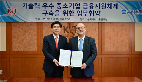 KIST와 우리은행은 9일 이병권 원장과 이광구 은행장이 참석한 가운데 KIST에서 '기술력 우수 중소기업 금융지원체제 구축을 위한 업무협약(MOU)'을 체결했다고 밝혔다.