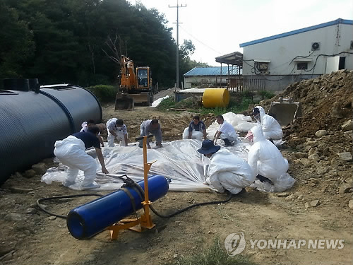 | △ 한 돼지농장 인근에서 인부와 공무원들이 구제역에 감염된 돼지를 살처분하고 있다.(독자 제공=연합뉴스 자료사진) |