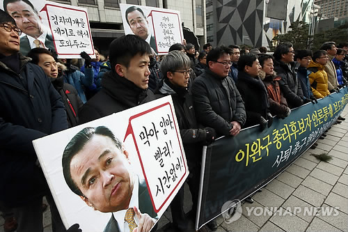 | △ '즉각 사퇴하라!' (서울=연합뉴스) 박동주 기자 = 9일 오후 서울 프레스센터 앞에서 현업 언론인 등이 언론사에 대한 보도 개입 등 외압 의혹을 불러온 이완구 총리 후보자를 비판하며 사퇴를 촉구하고 있다. 2015.2.9 pdj6635@yna.co.kr |