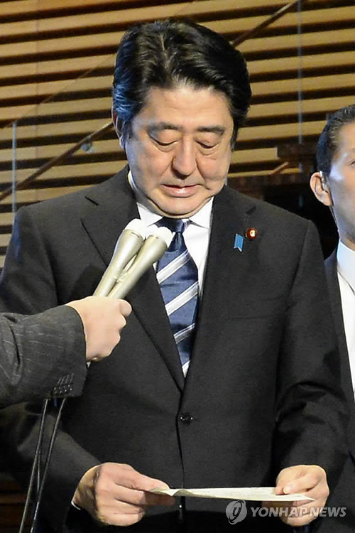 | △ IS 일본인 살해 입장 밝히는 아베 총리 (도쿄 교도=연합뉴스.자료사진) 1일 새벽 이슬람 수니파 원리주의 무장단체 이슬람국가(IS)가 일본인 인질 고토 겐지(後藤健二·47) 씨를 참수했다고 주장하는 영상을 공개한 뒤 아베 신조(安倍晋三) 총리가 기자들 앞에서 입장을 발표하면서 괴로운 듯 얼굴을 찡그리고 있다. 2015.2.1 jhcho@yna.co.kr |