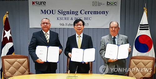 | △ 무역보험공사, 쿠바와 6천만유로 수출 신용거래 개설 (서울=연합뉴스) 이웅 기자 = 한국무역보험공사가 9일(현지시각) 쿠바 수도 아바나에서 쿠바중앙은행(BCC), 쿠바대외은행(BEC)과 '한국기업의 대(對)쿠바 수출지원을 위한 무역보험 신용공여 양해각서(MOU)'를 체결했다고 10일 밝혔다. 이번 MOU는 무역보험공사가 쿠바로 제품을 수출하는 한국 기업에 6천만 유로(750억원) 한도의 무역보험을 제공하고, 쿠바중앙은행은 수입 대금결제를 위해 쿠바대외은행을 통해 개설한 신용장에 대해 승인서를 발급하기로 한 것이 골자다. 2015.2.10 << 무역보험공사 제공 >> lapia@yna.co.kr |