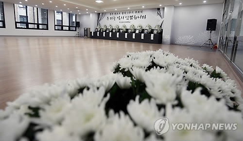 | △ '리조트참사 1주기' 부산외대에 추모공간 (부산=연합뉴스) 김선호 기자 = 오는 17일 경주 마우나오션리조트 체육관 붕괴참사 1주기를 앞두고 부산외국어대학 체육관에 사고로 숨진 학생 9명을 기리는 추모의 공간이 마련돼 있다. 2015.2.10 wink@yna.co.kr |