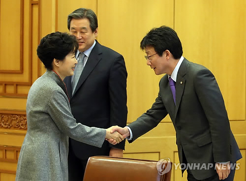 | △ 유승민 원내대표와 악수하는 박 대통령 (서울=연합뉴스) 도광환 기자 = 박근혜 대통령이 10일 오전 청와대를 방문한 새누리당 지도부와의 접견에서 유승민 원내대표와 악수하고 있다. |