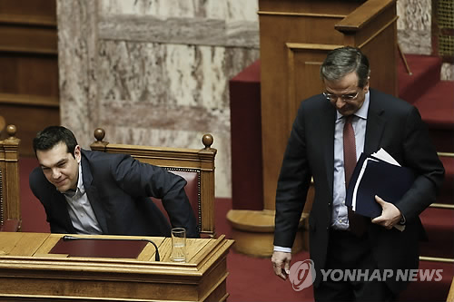 | △ '구제금융 구걸 않겠다' 이 말씀… (AP=연합뉴스) 알렉시스 치프라스 새 총리 내각에 대한 신임 투표를 앞둔 10일(현지시간) 아테네의 그리스 의회에서 안토니스 사마라스(오른쪽) 전 총리가 알렉시스 치프라스 총리 곁을 지나고 있다. |
