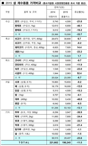이에 따라 이 기간 홈플러스에서 23개 제수용품을 마련해 차례상을 차릴 경우, 4인 가족 기준 비용(19만6천245원)이 작년 설 중소기업청·소상공인시장진흥공단 조사 당시 전국 대형마트 평균 차례상 비용(22만1천662원)보다 2만5천417원 싸다는 게 홈플러스측의 설명이다.