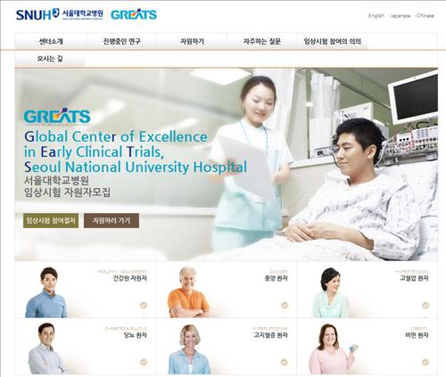 (서울=연합뉴스) 김길원 기자 = 서울대학교병원 임상시험센터(센터장 방영주)는 임상시험 희망자들이 자신의 조건에 맞는 임상시험 참여 정보를 손쉽게 얻을 수 있는 웹사이트(snuhclinicaltrials.com)를 국내 처음으로 개설했다고 11일 밝혔다.