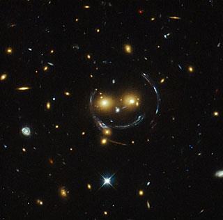 사진 속에서 흡사 큰 두 눈처럼 보이는 것은 두 개의 밝은 은하, 미소와 얼굴 경계선은 빛이 우주 물체의 중력에 의해 휘고 굴절하는 '중력 렌즈' 현상 때문에 빚어진 것이라고 NASA는 소개했다.