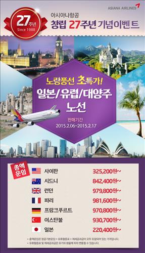 아시아나항공 창립 27년을 기념하기 위해 선보인 이번 이벤트에서 일본·유럽·대양주 노선 등의 항공권을 파격적인 가격에 구입할 수 있다.