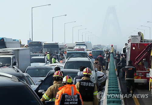 (인천=연합뉴스) 강종구 기자 = 인천경찰청은 11일 영종대교 추돌사고 차량이 105대에서 106대로 늘어났다고 밝혔다.