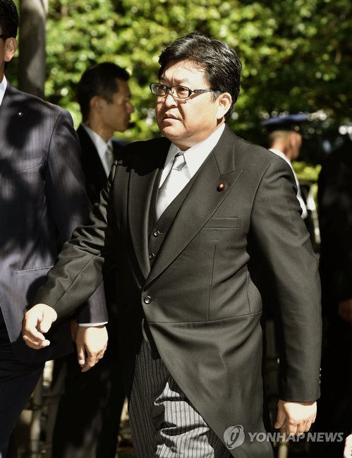 | △ 2014년 8월 15일 아베 신조 총리를 대신해 공물료를 내기 위해 야스쿠니 신사를 방문한 하기우다 고이치. (교도=연합뉴스DB) |
