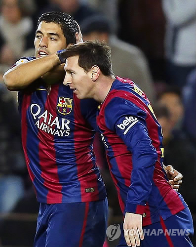 | △ 바르셀로나의 리오넬 메시(오른쪽)가 12일(한국시간) 스페인 바르셀로나에서 열린 비야레알과의 2014-2015 스페인 국왕컵 준결승 1차전에서 골을 터트린 뒤 루이스 수아레스와 기쁨을 나누고 있다.(EPA=연합뉴스) |