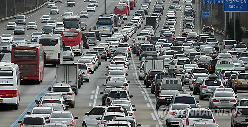 | △ 남성의 명절증후군은 장거리 운전 등으로 허리통증이 가장 많은 것으로 조사됐다. 사진은 설 연휴 귀성 차량들이 경부고속도로 하행선을 가득 메우고 있는 모습(연합뉴스 자료사진) |