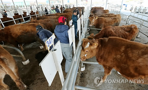 | △ 다시 문을 연 가축시장 (영천=연합뉴스) 김준범 기자 = 12일 오전 경북 영천의 가축시장에서 경매가 이뤄지고 있다. 경북도는 전국적으로 번진 구제역으로 지난달 14일부터 영천 가축시장의 거래를 정지했지만 설을 맞아 한우농가의 경제적 어려움을 해소하고자 임시 개장했다. 2015.2.12 psykims@yna.co.kr |