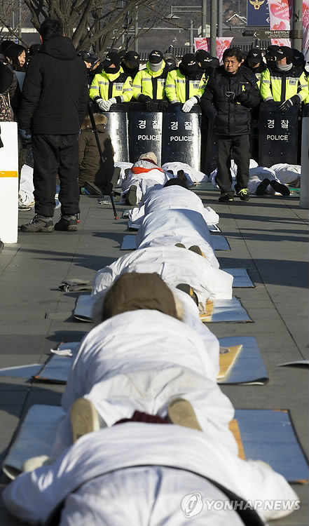 | △ '막지말라' (서울=연합뉴스) 윤동진 기자 = 쌍용차 해고자 복직과 정리해고 전면철폐를 위한 오체투지 행진단 참가자들이 12일 오전 서울 종로구 정부서울청사 앞에서 경찰에 가로막혀 제자리에 멈춰 있다. 이날 오체투지 행진을 마친 이들은 기자회견에서 쌍용차 해고자 전원 복직과 정리해고 비정규직법제도를 전면 폐기할 것을 주장했다. 2015.1.12 mon@yna.co.kr |