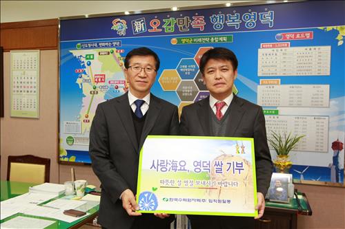| △ 한국수력원자력이 12일 경북 영덕군청에서 '사랑海요 영덕쌀' 전달 행사를 했다.(이희진 영덕군수(오른쪽)와 이용현 한수원 지역상생협력처장(왼쪽)). |