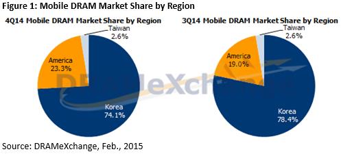 13일 반도체 전자상거래사이트 D램익스체인지에 따르면 삼성전자는 2014년 4분기 모바일 D램 시장에서 점유율 46.1%를 나타냈다.