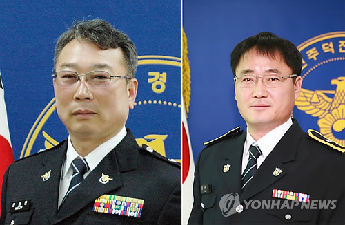 | △ 응급환자 구한 교통경찰들 (전주=연합뉴스) 김진방 기자 = 전북 전주덕진경찰서 교통관리계 문병돈(왼쪽) 경위와 김순근 경위는 교통 예방 순찰 중 응급환자를 발견하고 신속히 병원으로 이송했다. 두 경찰관은 긴급출동 담당이 아니지만 신고자 인근을 순찰하던 중 신고를 받고 신속하게 출동했다. 2015.2.13 chinakim@yna.co.kr |