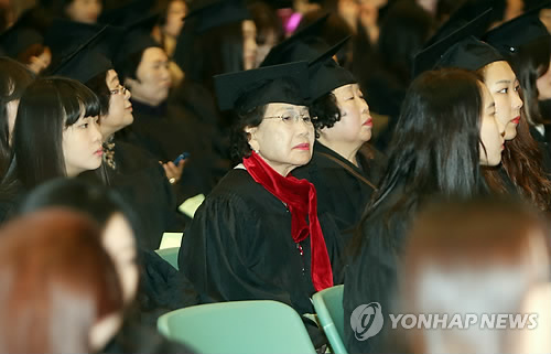 | △ (부산=연합뉴스) 차근호 기자 = 전국 최고령 대학졸업생인 박덕채(89) 할머니가 13일 부산시 부산진구 양정동 부산여대 사회복지재활과 졸업식장에서 20대 여대생 동기들과 졸업식을 하고있다. 2015.2.13 ready@yna.co.kr |
