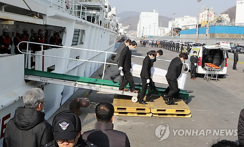 | △ (부산=연합뉴스) 지난달 11일 부산시 사하구 감천항 2부두에서 오룡호 한국인 선원 시신 6구가 운구돼 들어오고 있다. |