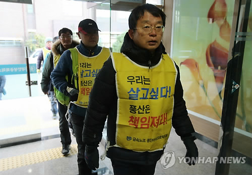 | △ 투쟁 복장 입고 첫 출근한 피에스엠씨 복직자 (부산=연합뉴스) 차근호 기자 = 3년간 투쟁을 벌인 끝에 회사 측의 복직 통보를 받은 피에스엠씨의 해고 근로자들이 2일 오전 부산시 남구 인력개발원으로 직무 재교육을 받기위해 첫 출근하고 있다. 이들은 사측이 복직을 통보하면서 한편으로는 부당해고를 다투는 대법원 상고를 진행하는것에 항의하는 의미로 노숙투쟁을 벌이던 복장그대로 출근했다. 2014.12.2 ready@yna.co.kr |