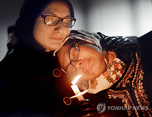 | △ (AP=연합뉴스) 11일(현지시간) 미국 노스캐롤라이나주 채플힐에서 백인 남성에 피격돼 사망한 무슬림 대학생들의 추모 집회에 참석한 두 여성이 슬픔에 잠겨 있다. 전날 노스캐롤라이나 대학 인근 주택가에서 세 사람을 살해한 크레이그 스티븐 힉스는 경찰에 자수했고, 경찰은 힉스를 1급 살인 혐의로 체포했다. Women mourn during a vigil for three people who were killed at a condominium near UNC-Chapel Hill, Wednesday, Feb. 11, 2015, in Chapel Hill, N.C. Craig Stephen Hicks appeared in court Wednesday on charges of first-degree murder in the deaths Tuesday of Deah Shaddy Barakat, his wife Yusor Mohammad and her sister Razan Mohammad Abu-Salha. (AP Photo/The Herald-Sun, Bernard Thomas) |