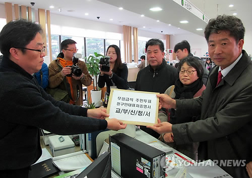 | △ '무상급식' 주민투표 청구인 대표자 증명서 신청 (창원=연합뉴스) 김영만 기자 = 5일 경남도청 민원실에서 친환경 무상급식 지키기 경남운동본부에서 활동하는 여영국 경남도의원과 각계 단체 대표 등이 '무상급식 주민투표 청구인 대표자 증명서 교부 신청서'를 도청 공무원에게 전달하고 있다. 이는 경남도와 일선 시·군에 학교 무상급식 이행과 지방자치단체의 예산 지원을 촉구하려는 것이다. 이들은 경남도로부터 증명서를 받아 도민의 서명운동에 들어갈 예정이다. 2015.2.5 ymkim@yna.co.kr |