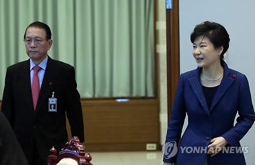 | △ 박근혜 대통령과 김기춘 비서실장이 지난달 26일 오전 청와대 위민관에서 열린 수석비서관회의에 입장하고 있다. (연합뉴스 자료사진) |
