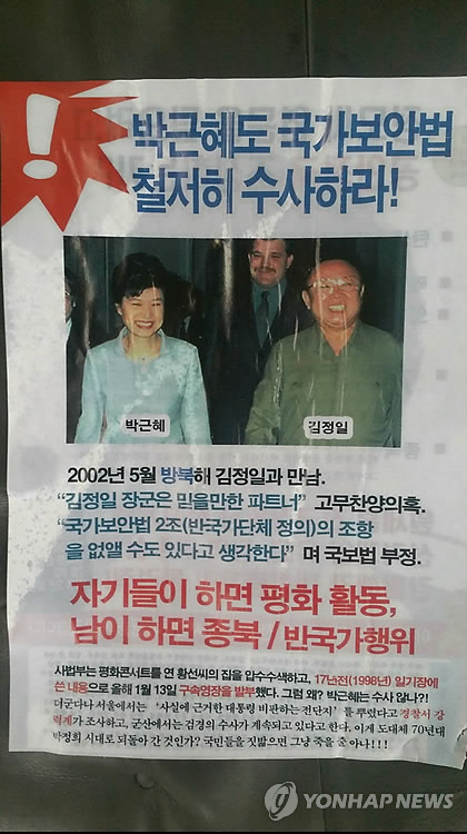 이 유인물은 A4용지 크기로 앞면에는 박 대통령이 김정일 전 북한 국방위원장과 나란히 서서 찍은 사진과 함께 '박근혜도 국가보안법 철저히 수사하라!', '자기들이 하면 평화활동, 남이하면 종북/반국가행위' 등 구호성 내용, 황선씨 등 구속과 관련한 글이 적혀 있다.