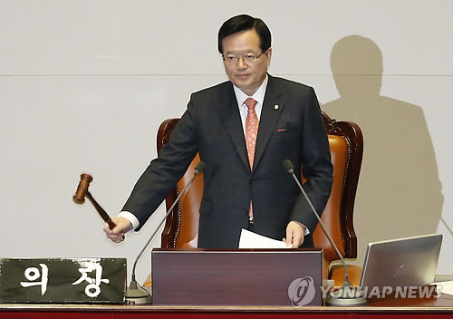 | △ 이완구 국무총리 후보자 임명동의안 가결 (서울=연합뉴스) 이상학 기자 = 정의화 국회의장이 16일 국회에서 열린 제331회 국회 (임시회) 제4차 본회의에서 이완구 국무총리 후보자 임명동의안 가결을 발표한 뒤 의사봉을 두드리고 있다. |