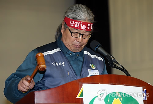 | △ 현대중공업, 2014년 임단협 타결 (울산=연합뉴스) 김용태 기자 = 16일 오후 울산 현대중공업 본사에서 정병모 노조위원장이 2014년 임단협 교섭이 타결됐음을 선언하고 있다. 2015.2.16 yongtae@yna.co.kr |