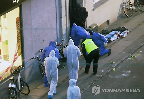 | △ 덴마크 코페하겐에서 총격테러를 벌이던 용의자가 15일(현지시간) 경찰에 사살돼 노레브로역 인근 도로에 쓰러져 있는 가운데 수사관들이 현장을 조사하고 있다. (AP/TV2노르웨이=연합뉴스) |