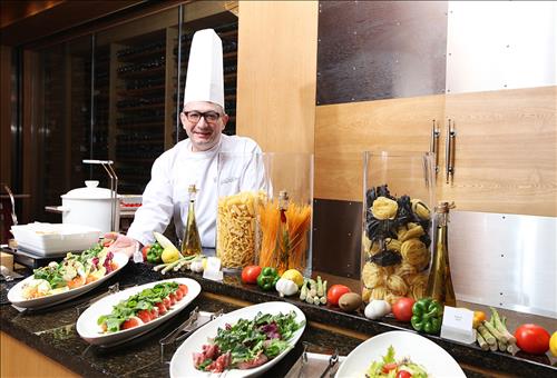 빵, 수프, 훈제연어 샐러드, 살라미, 피자, 즉석조리 파스타, 닭고기 그라탱, 케이크와 각종 디저트, 계절 과일 등이 준비되며, 매일 2가지 육류 요리를 선보이는 코너도 마련된다.