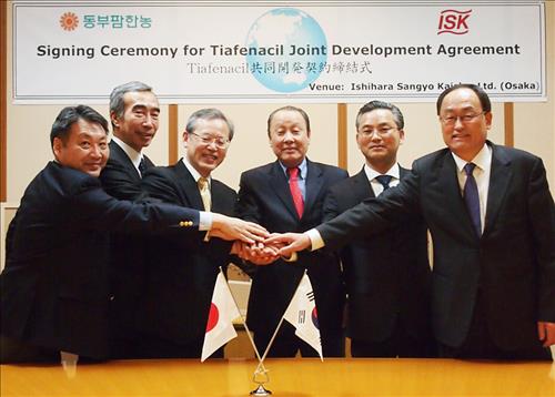(서울=연합뉴스) 박대한 기자 = 동부팜한농은 신물질 제초제 '테라도(Terrad’or)' 개발을 완료하고 일본의 농화학업체인 ISK(Ishihara Sangyo Kaisha)와 해외시장 공동개발계약을 체결했다고 17일 밝혔다.