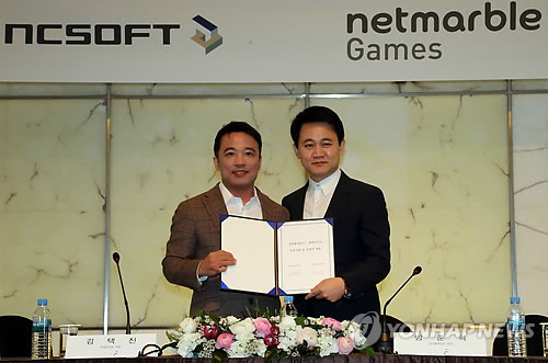 (서울=연합뉴스) 고상민 기자 = 엔씨소프트[036570](엔씨)와 넷마블게임즈(넷마블)는 17일 서울 소공동 더플라자 호텔에서 기자간담회를 열고 글로벌 게임 시장 진출을 위한 공동 사업 및 전략적 제휴를 체결했다고 밝혔다.
