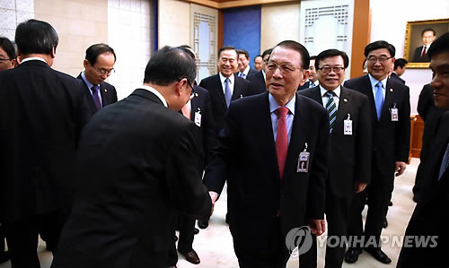 | △ 국무위원들과 악수하는 비서실장 (서울=연합뉴스) 도광환 기자 = 김기춘 청와대 비서실장이 17일 오전 청와대에서 열린 국무회의에 앞서 국무위원들과 인사하고 있다. |