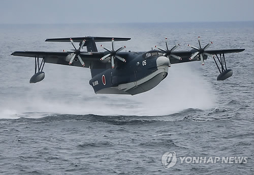 | △ (AP=연합뉴스.자료사진) 지난 2012년 10월14일 도쿄 남쪽 사가미만의 함대 사열식에서 해상자위대의 수륙양용 구조구난 US-2기가 해상착륙을 시도하는 모습. |