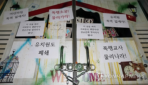 | △ 인천시 부평구 모 어린이집에 아동학대 항의 문구가 붙어 있다.(연합뉴스 자료사진) |