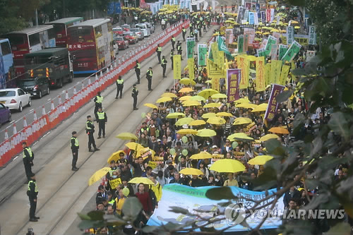 | △ 홍콩서 우산혁명 이후 최대 거리 행진 (홍콩=연합뉴스) 최현석 특파원 = 시민운동단체 민간인권진선은 1일 오후 시민 수천명을 이끌고 홍콩섬 코즈웨이베이 빅토리아 공원을 출발, 센트럴까지 행진하며 '정치적 제한 없는 행정장관(행정수반) 직선제' 실시를 요구했다. 이날 시위는 작년 12월 15일 끝난 79일간의 도심 점거 시위 이후 최대 규모로 기록됐다. 2015.2.1 <<국제뉴스부 기사 참조>> harrison@yna.co.kr |