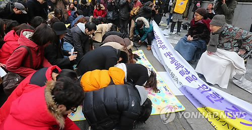 | △ 일본대사관 앞 세배 받는 위안부 피해 할머니들 (서울=연합뉴스) 황광모 기자 = 설 연휴 첫 날인 18일 오후 서울 중학동 일본대사관 앞에서 열린 제1166차 일본군 '위안부' 문제해결을 위한 정기 수요시위에서 집회가 열렸다. 이날 집회에 활동가들이 일본군 위안부 피해자인 김복동, 길원옥 할머니에게 위안부 문제의 조속한 해결과 건강을 기원하는 세배를 하고 있다. 2015.2.18 hkmpooh@yna.co.kr |