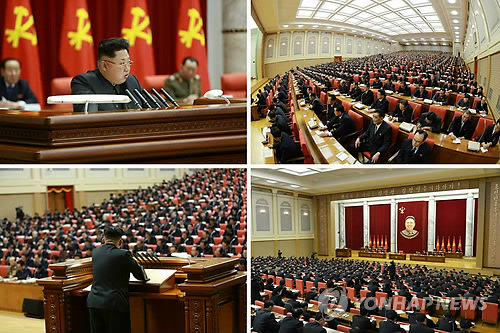 | △ 북한, 1년여만에 당 정치국 확대회의 (서울=연합뉴스) 북한은 18일 김정은 국방위원회 제1위원장이 참석한 가운데 노동당 중앙위원회 정치국 확대회의를 열어 김정일 국방위원장의 '유훈' 관철에 당의 역량을 집중하기로 결의했다. 북한이 당 중앙위 정치국 확대회의를 개최한 것은 장성택의 숙청을 결정한 2013년 12월 8일 회의 이후 처음이다. 노동신문이 19일 게재한 관련 사진에는 회의에서 연설하는 김 제1위원장의 모습이 보인다. |