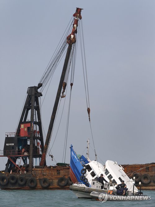 | △ 배안에 남은 사람 없나 (AP=연합뉴스) 중국 국경절인 1일(현지시간) 밤 홍콩 남서쪽 람마섬 인근 해상에서 직원들을 태우고 불꽃놀이 구경에 나섰던 홍콩전력 선박이 페리와 충돌, 침몰하면서 최소 36명의 사망자를 냈다. 부상자 100여명은 5개 병원에 분산돼 치료를 받고 있으나 이중 9명은 중태인 것으로 알려져 사망자가 더 늘어날 수 있을 것으로 보인다. 사진은 2일 반쯤 바닷물에 잠긴 사고 선박을 다른 대형 배가 크레인으로 고정시키고 있는 모습. bulls@yna.co.kr |