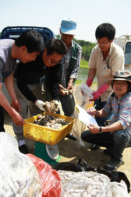 | △ 블루길 수매하는 어민들<<연합뉴스 DB>> |
