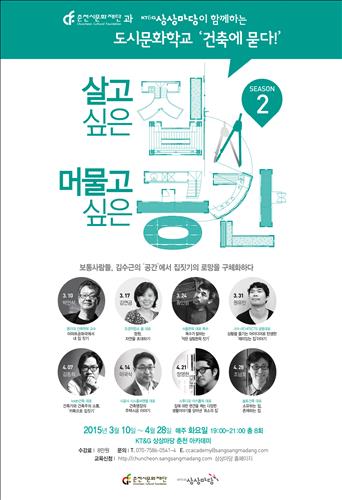 (서울=연합뉴스) 김아람 기자 = KT&G는 3월 10일부터 4월 28일까지 춘천 KT&G 상상마당에서 건축강좌 '살고 싶은 집, 머물고 싶은 공간 시즌2'를 연다고 20일 밝혔다.