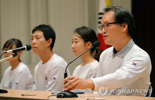 | △ 기자회견하는 에볼라 대응 해외긴급구호대 (인천 사진공동취재단=연합뉴스) 에볼라 전염병 확산을 막기 위해 서아프리카 시에라리온에 파견됐다가 지난달 26일 귀국한 정부의 에볼라 대응 해외긴급구호대 1진 가운데 신형식 국립중앙의료원 감염센터장(구호대팀장)이 지난 15일 인천 중구 운서동 정부합동청사에서 취재진과 인터뷰를 하고 있다. 이들은 이날 인터뷰를 끝으로 3주간의 국내 격리 관찰을 마치고 일상으로 복귀했다. 2015.2.22 photo@yna.co.kr |