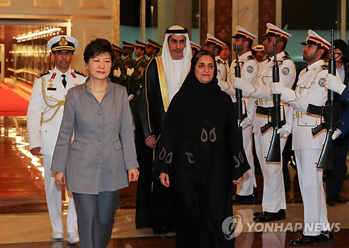 | △ 박근혜 대통령이 내달 1∼9일 쿠웨이트, 사우디아라비아, 아랍에미리트, 카타르 등 중동 4개국을 순방한다고 청와대가 발표했다. 박 대통령이 작년 5월 아랍에미리트 방문시 아부다비 국제공항에서 영접을 받고 있다. (연합뉴스 자료사진) |