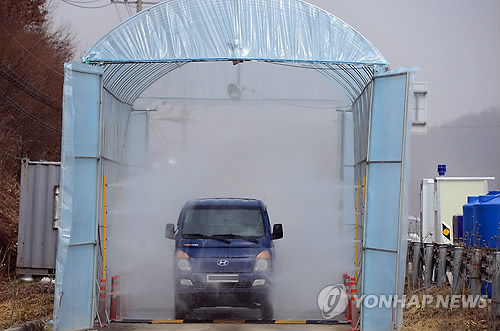 | △ '구제역 방역 강화' (홍성=연합뉴스) 김준호 기자 = 전국 최대 양돈 단지가 있는 충남 홍성에서 잇달아 구제역이 발생하고 있는 가운데 22일 한 축산 관련 차량이 홍성군 홍북면에 설치된 거점 소독시설을 통과하고 있다.2015.2.22 kjunho@yna.co.kr |