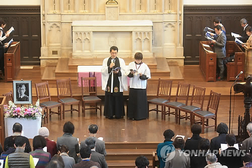| △ 도쿄 릿쿄대에서 윤동주 70주기 추도 예배 (도쿄=연합뉴스) 조준형 특파원 = 22일 오후 시인 윤동주(1917∼1945)가 생전 8개월 가량 다녔던 도쿄 릿쿄(立敎)대의 예배당에서 윤 시인 70주기 추도 예배가 열렸다. 2015.2.22 jhcho@yna.co.kr |